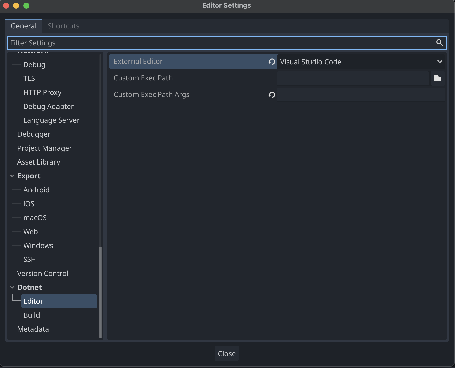 - In the Godot Engine, click on Editor -> Editor Settings, then scroll down on the sidebar, under Dotnet click on Editor, and change the external editor to VSCode.