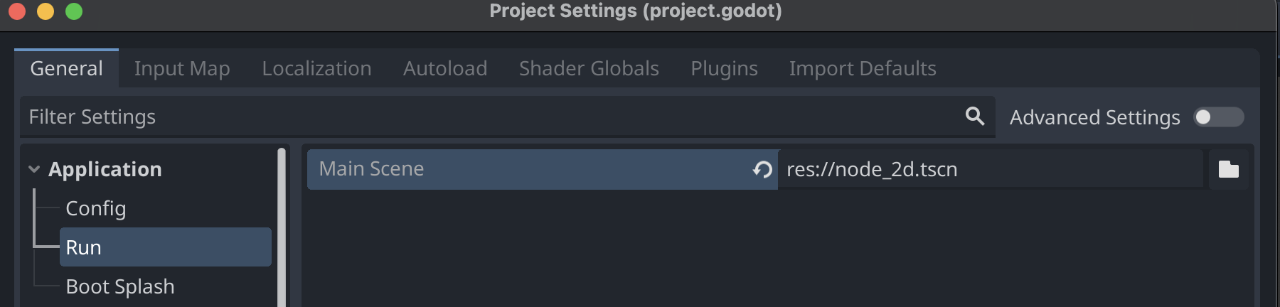 - In the Godot Engine, click on Project -> Project Settings, then on the sidebar under Application, click on Run and set a main scene.